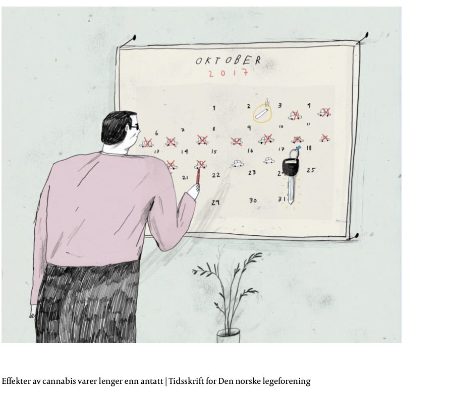 I følge Jørg Mørland og Jørgen Bramness kan man være påvirket av cannabis i 14 dager etter siste inntak. (Tidsskriftet for Den norske legeforening 30.10.2017)